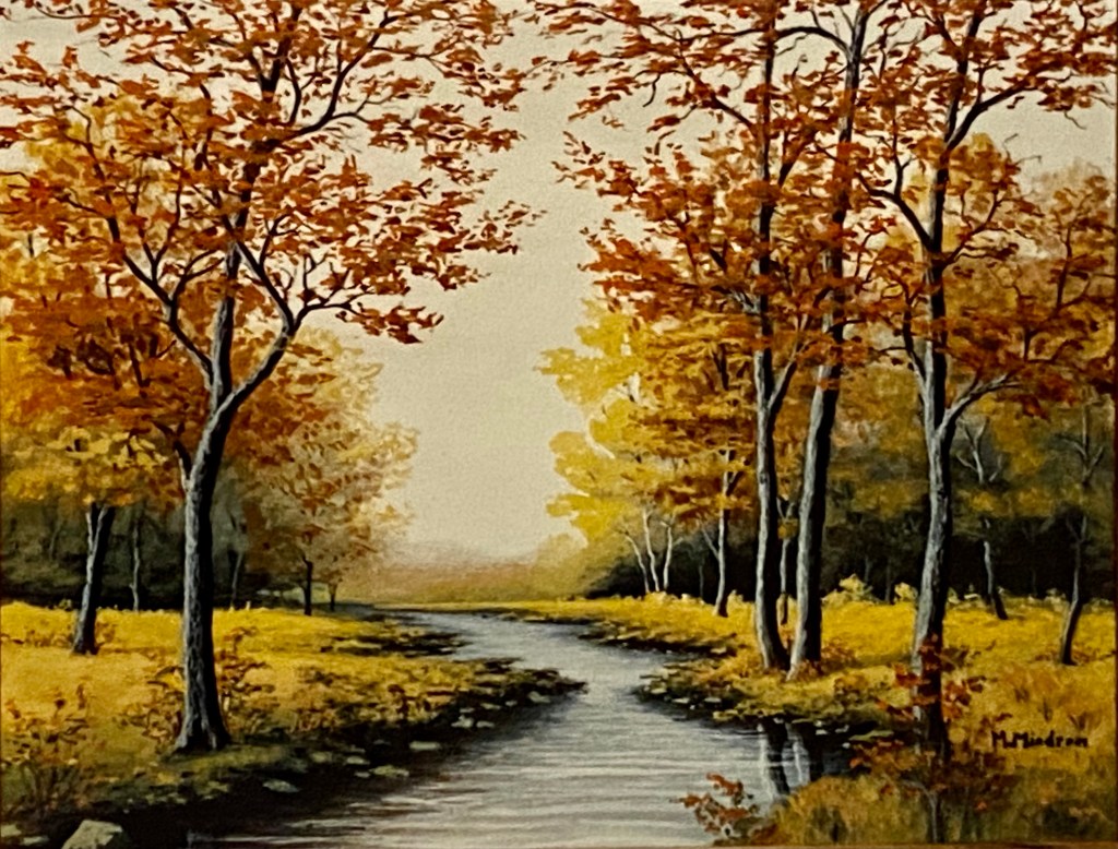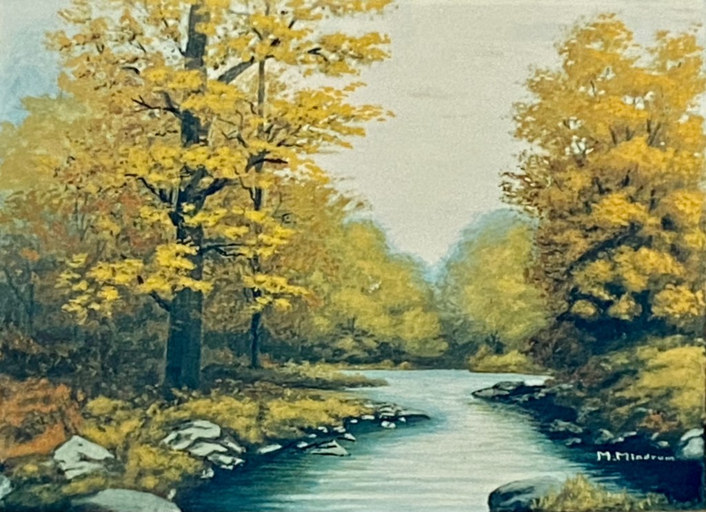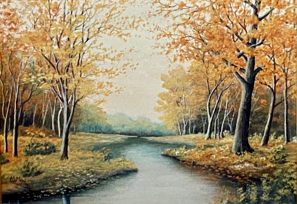 Margit often produced this very traditional scene of a river flowing toward the viewer through a wooded landscape.