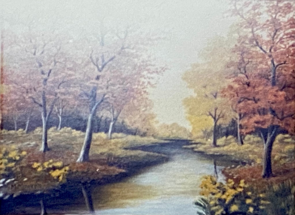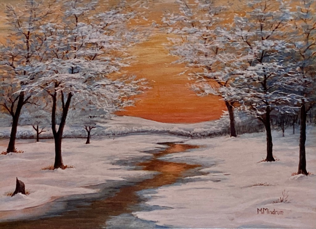 Maybe Margit was tired of painting the same fall scene. Here she envisions what the stream could look like on a “winter evening”. It must have recently snowed as snow hangs on the trees much like leaves do in her autumn landscapes.