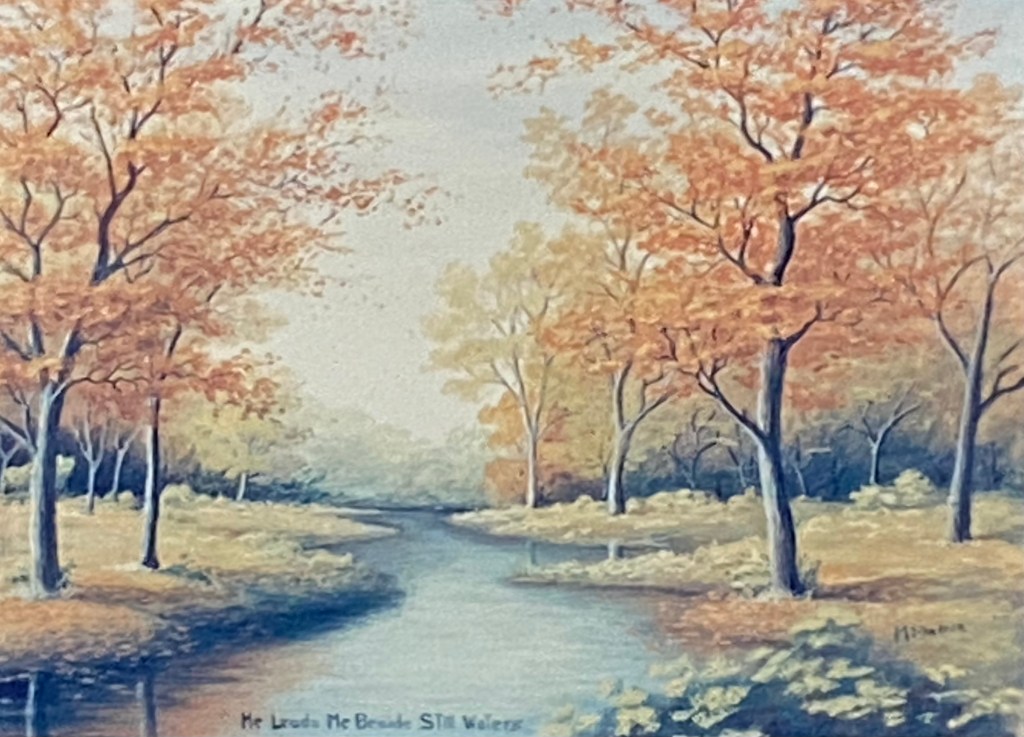 It’s safe to say this painting (67-02) was produced at the same time as the previous painting (67-01). But here Margit adds the line “He Leads Me Beside Still Waters”. We don’t know if the buyer requested the quote for his painting. Unlike most “The Lord is My Shepherd” paintings, there are no sheep here standing in for “Me”.