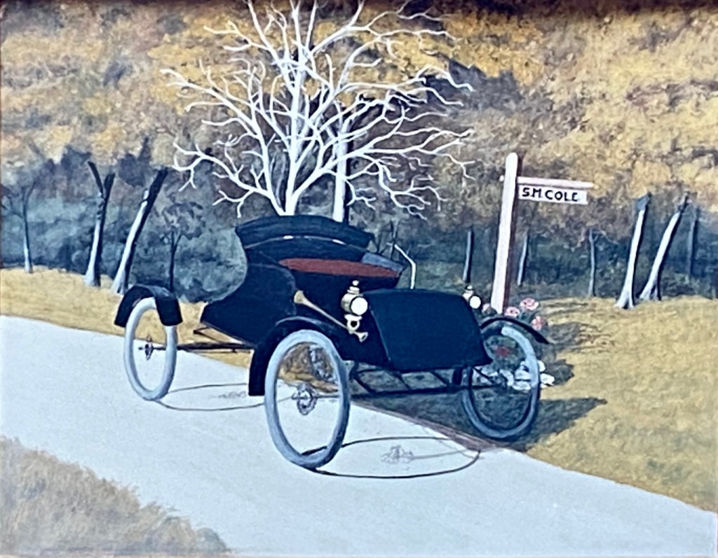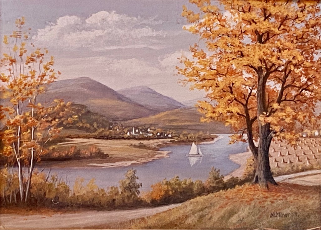 - Comment: The scene could be like so many that Margit painted– fall colors, cornshocks, a river or small lake. But a sailboat? When someone pointed out nobody would try to sail on that small body of water, Margit was embarrassed. (Hey, what did this farmgirl know about sailing anyway!) It’s believed Margit never attempted another boat with sails. Of course, with a name of “Like Nancy’s”, one must ask what Nancy’s looks like.