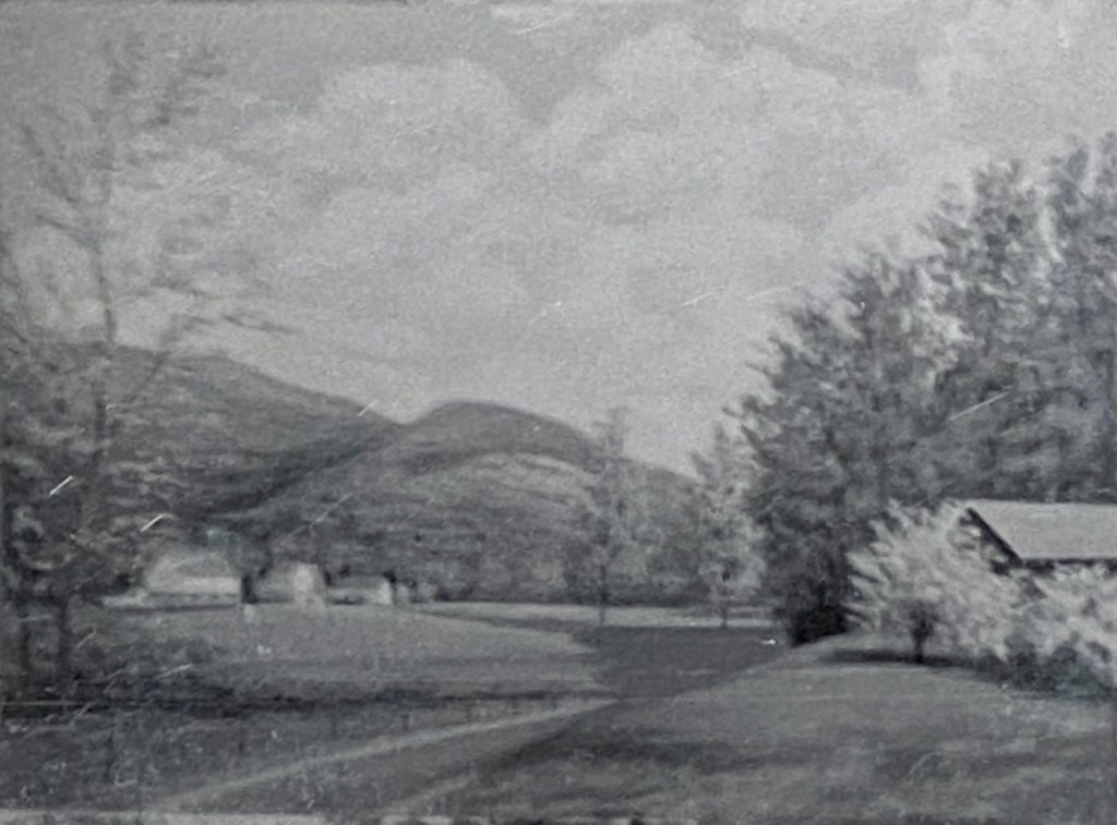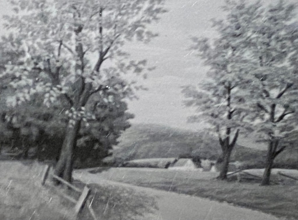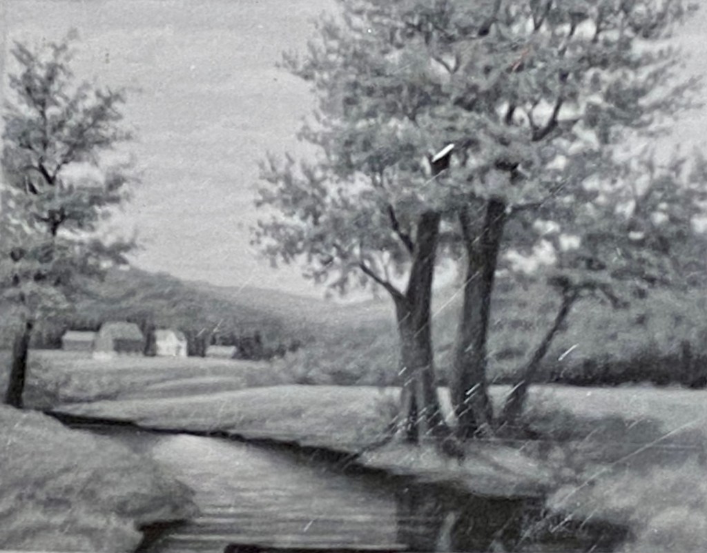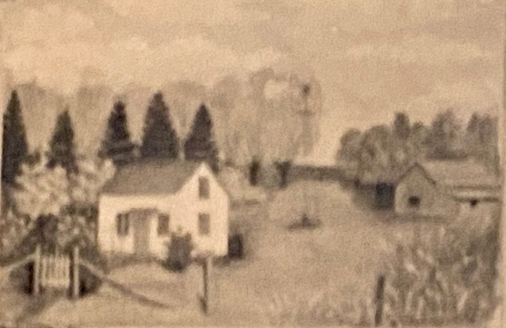 This early painting shows a farmstead with a small house, a windmill, and a barn. The season may be spring (because of the lighter foliage to the left of the house). A barbed-wire fence (with a picket-fence gate) stretches across the front—and “lollipop” trees are in the background.