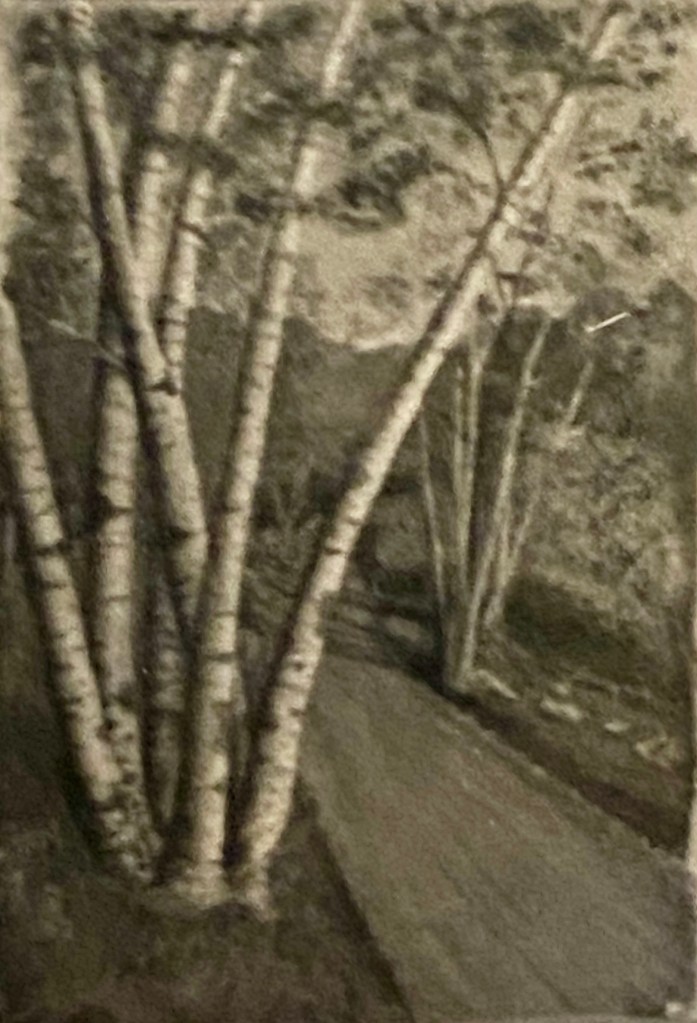 In this scene (done in portrait orientation) a group of birches on the left dominates the picture as the road travels diagonally from behind the birches to the right foreground.