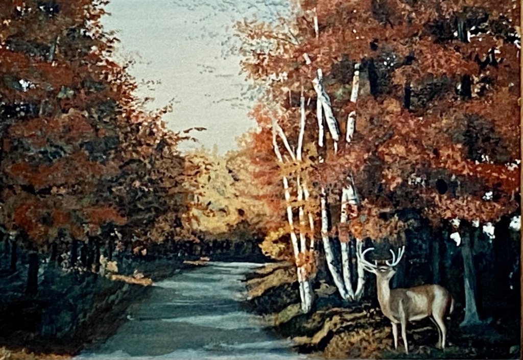 This is a fairly early painting where Margit didn’t even think the deer was worth mentioning in the title. The emphasis is on the road. And of course, it being fall, deer like to hang by the road.
