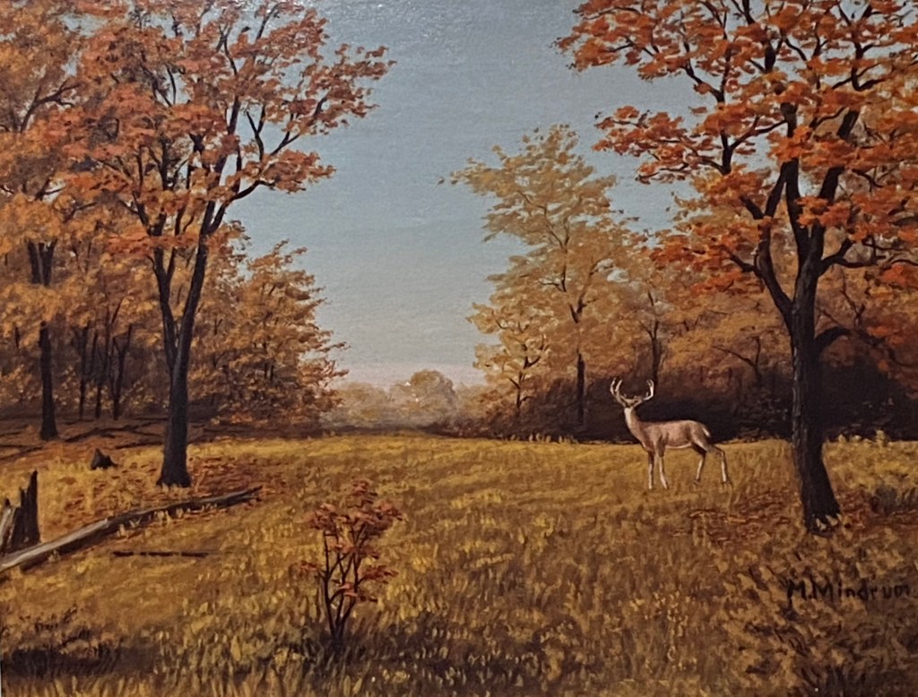 This is about as large as Margit will paint an animal. Framed by the gap in the trees behind him, the deer stands poised with his nose seemingly lifted to catch any odor on the breeze.