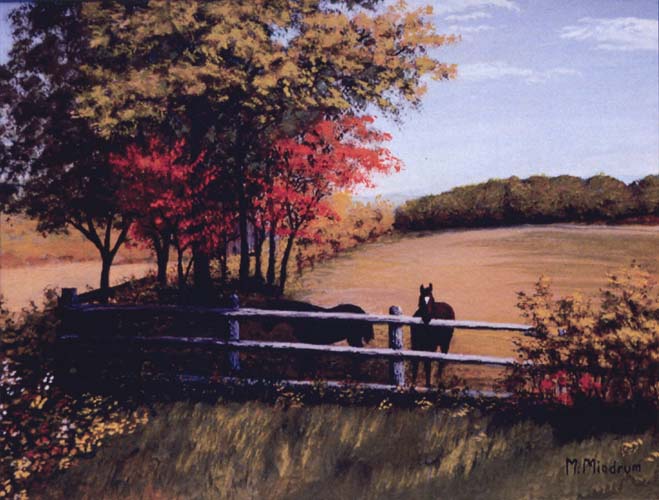 You might think it odd to pair up deer and horses. There are similarities and differences in Margit’s representations of these two large animals. Their commonality is… there are just too few of them included in her paintings (IMO). How do they differ? For one, the deer is always, understandably, a wild animal. It’s seen out in fields or along roadsides. Horses, on the other hand, are usually being worked. They’re pulling a wagon, a sleigh, or a plow, often as a team. When they’re not under harness, they’re still being controlled by man—as they stand behind a fence. Why not show a horse out in a field far from any fence, like Margit has shown plenty of cattle—and even sheep?