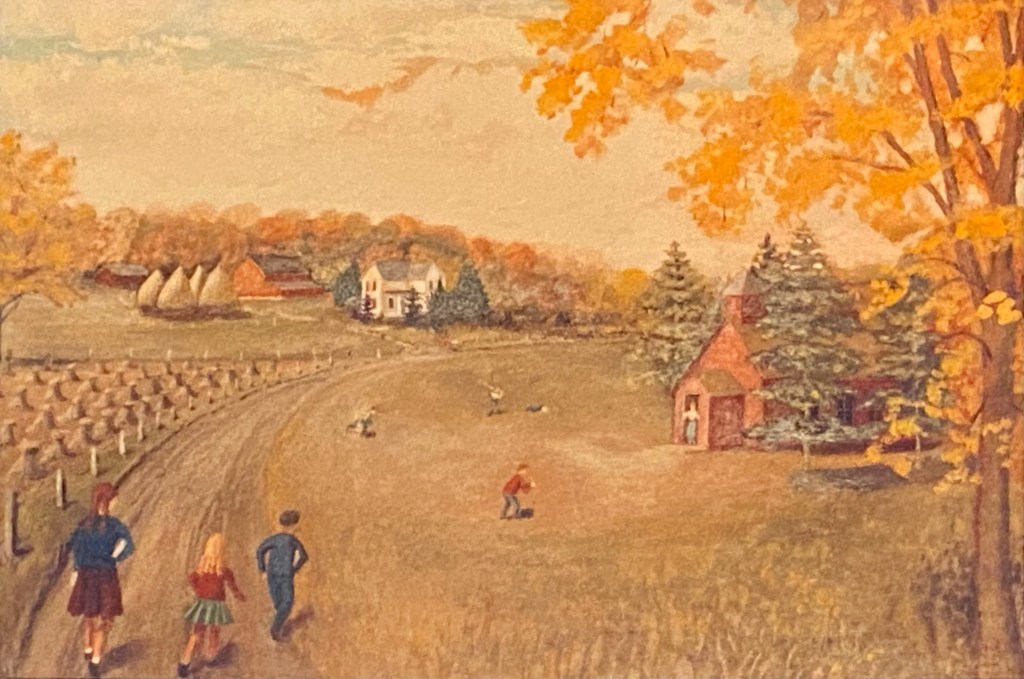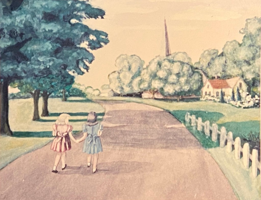 Margit recreates the road to church but adds two girls (her two daughters?) to the scene. She also throws in a fence, a more detailed house, more interesting branches to the trees….