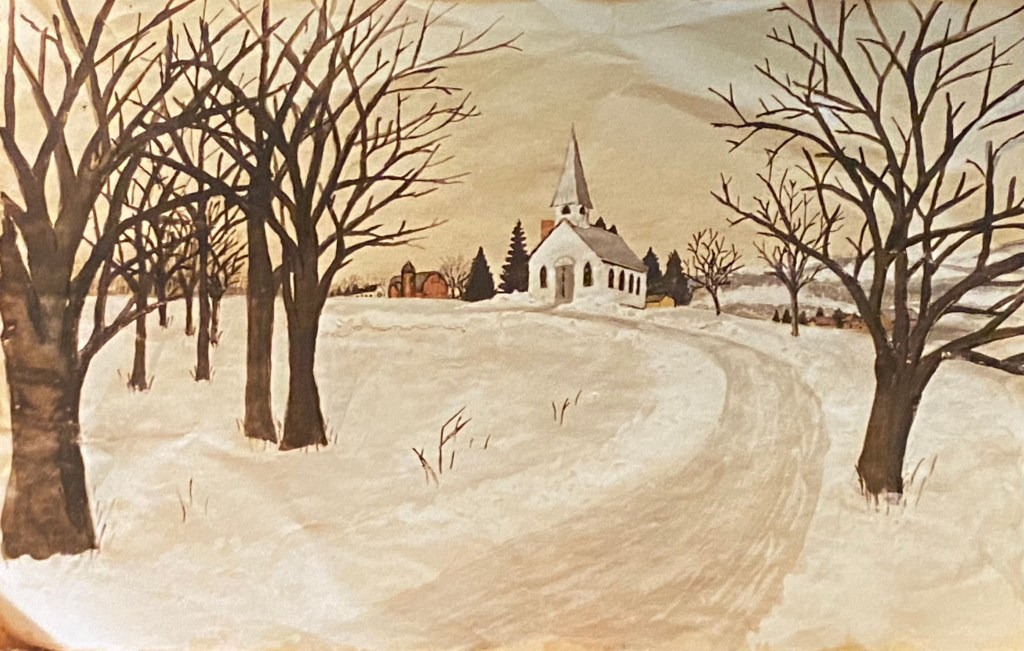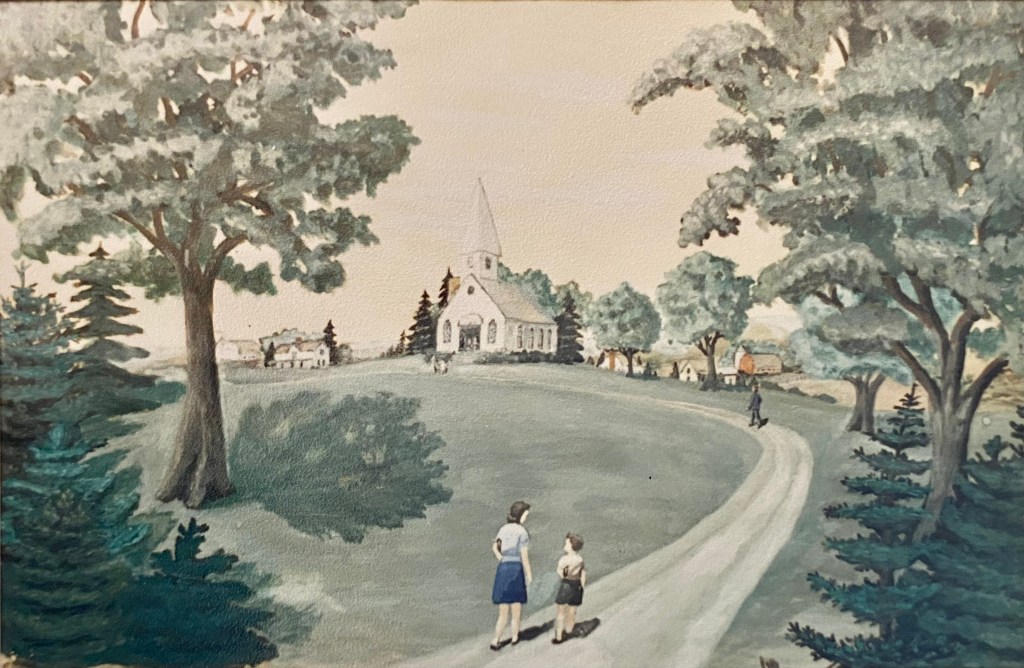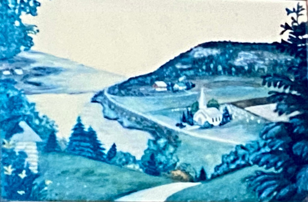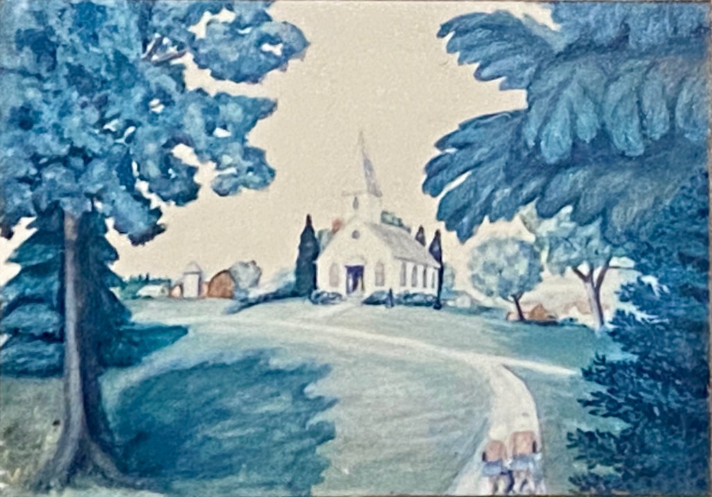 It’s rare for Margit to hide a church behind trees (see below). In fact later when she painted the Stone Church, she “removed” trees from in front of the church. When someone commented on the missing trees, she would ask, in essence, “You want to see the church, don’t you?