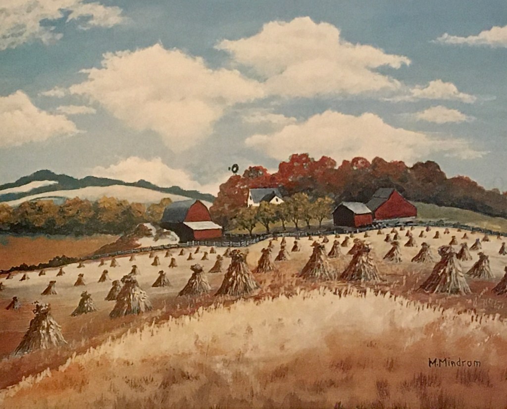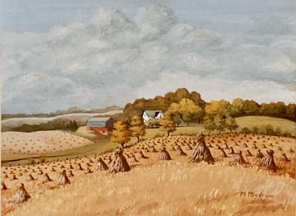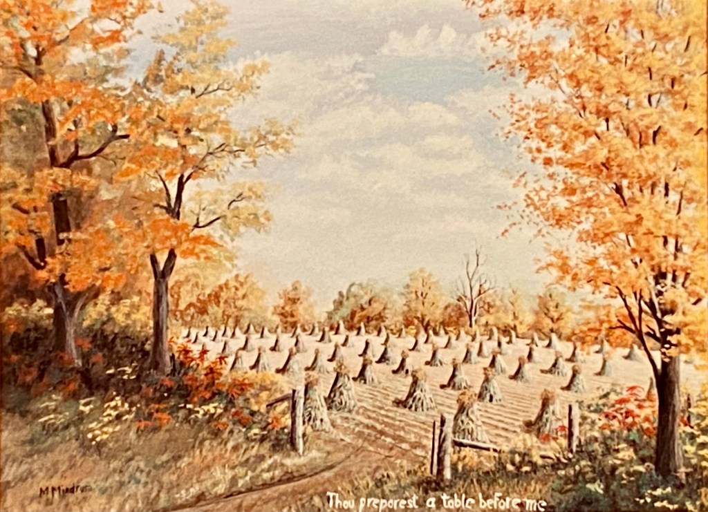 Corn shocks serve as an image of fall and the harvest. Margit included corn shocks in some of her earliest paintings. And she returned to them year after year. She also used them as a symbol of God’s blessings, often with the tagline of “Thou Preparest a Table Before Me” (see Religious paintings). See also “Wilson’s farm”.