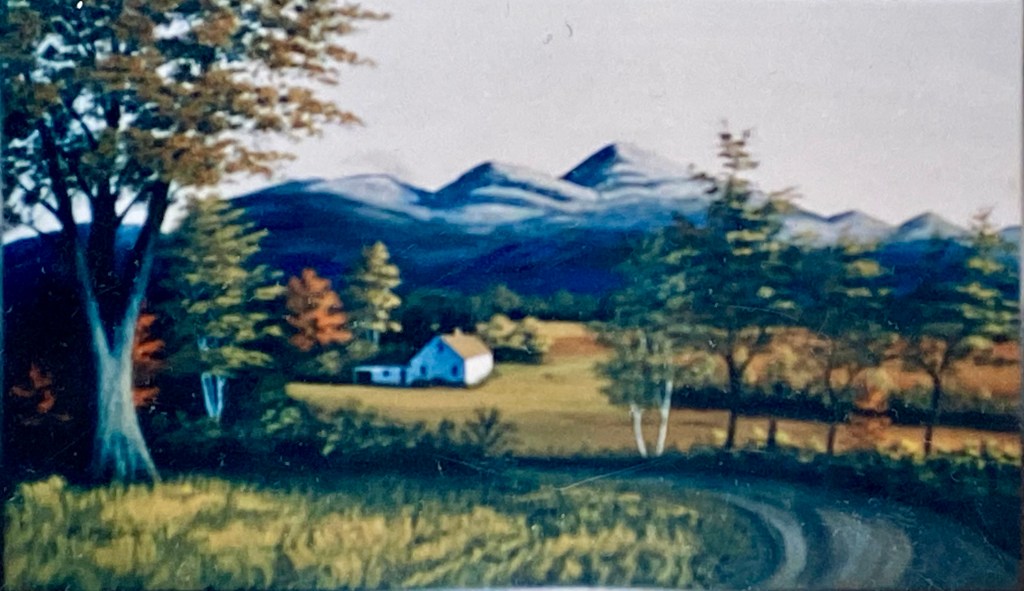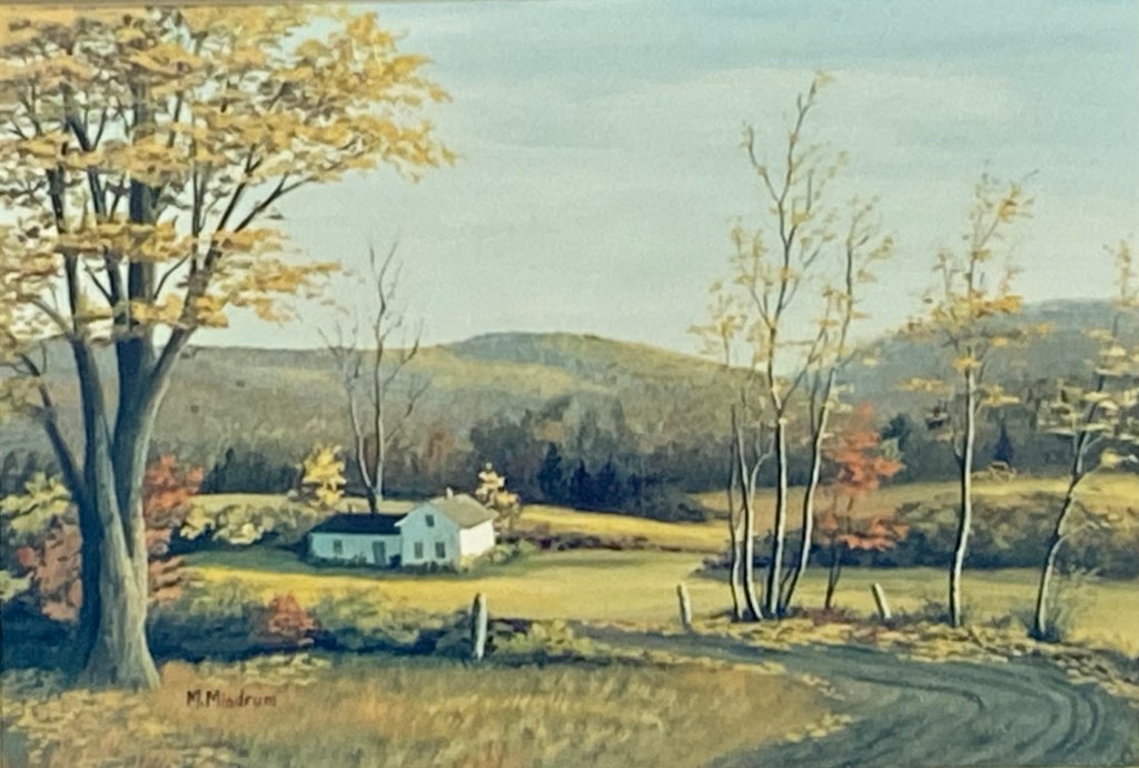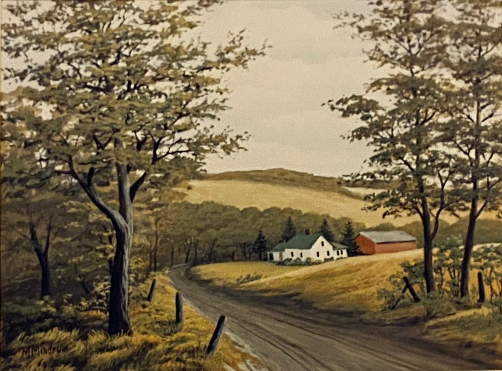 Living in farm country, and being a farmer herself, of course Margit created paintings of farms. Several distinct compositions emerge from her farm paintings. Here are two that you could call “farm down the road” and “farm across the road”.