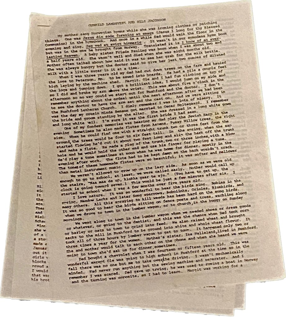 In converting Gunhild’s story from typed sheets to online pages, we didn’t change her content. However, we rearranged some sentences and paragraphs for better flow. We also smoothed out some transitions, fixed typos, and added commas. We added subheadings to help you understand structure, and inserted paragraph breaks so it’s easier to read. (We hope to attach some photos—and their captions). Still, it’s all Gunhild. Enjoy!