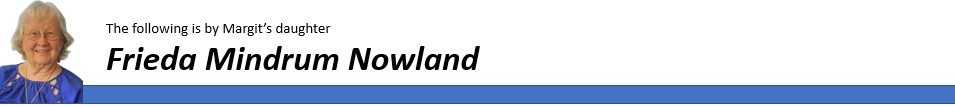 Shortly before she died in 1975, Margit Mindrum wrote up her life’s story. Well, at least she jotted down snippets from her life. She called her collection of memories “No Change My Heart Shall Fear”. [Editor’s note: That title can be a mouthful, so on this website you may see it referred to as NCMHSF.]