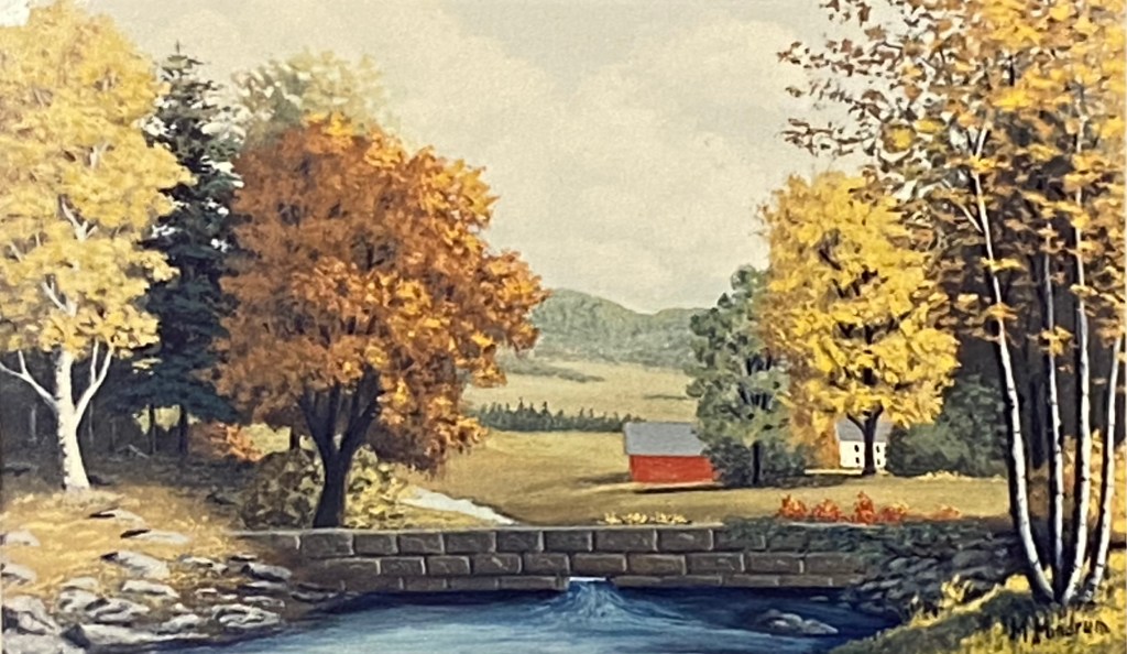 - Comment: In the continuing evolution of the stream, the rock has been replaced by what appears to be a small dam. Not only are the red barn and white house still there, even the primary trees retain their previous positions.