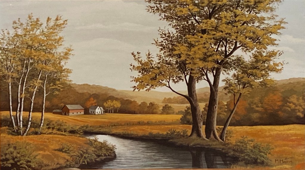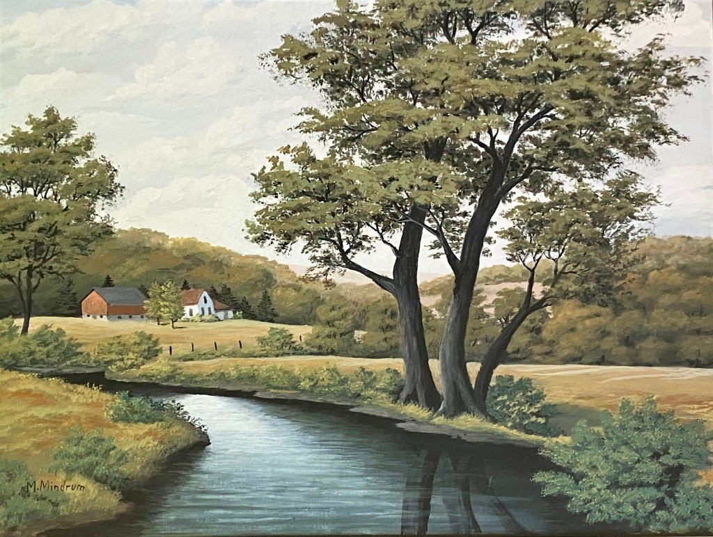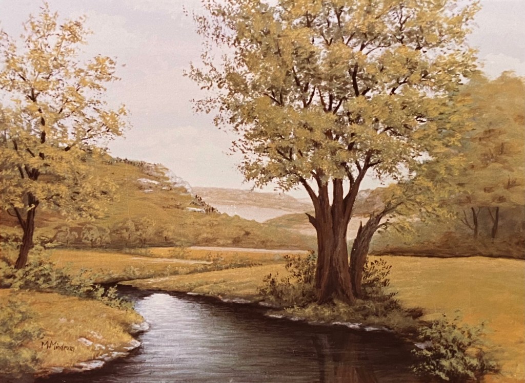 One of Margit’s earlier paintings (her first in 1961) was a landscape of a bright summer day in the country. In it, a wide stream flows placidly into the foreground between golden fields. On the stream’s bank a large tree, just right of center, dominates the scene, balanced by a farmstead on the left in the middle-distance.