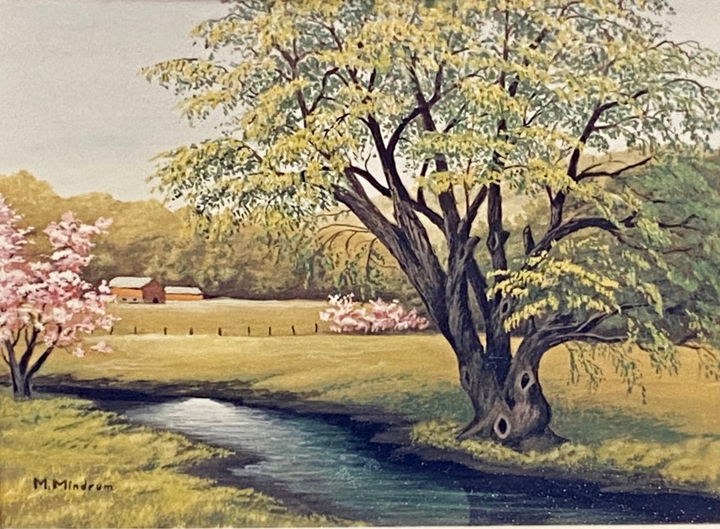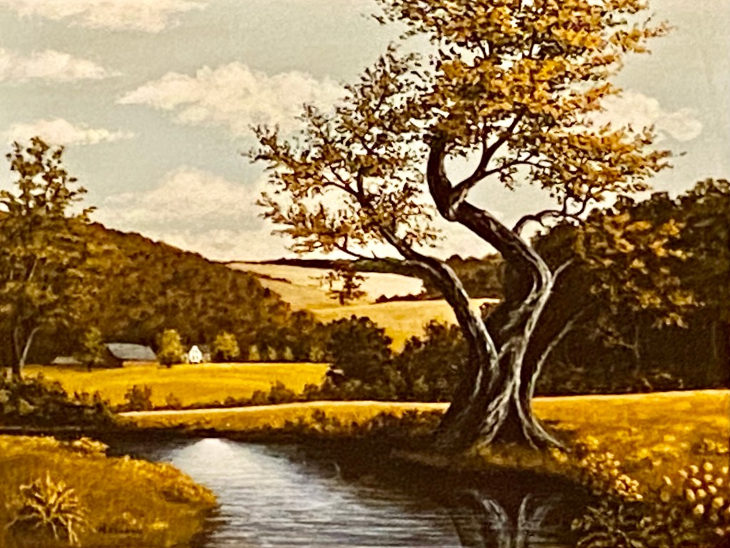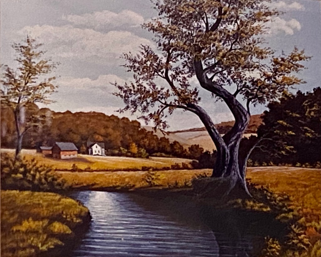 Besides being set in the spring, this one differs from “Like Ours” paintings by the tree’s large circles left by missing limbs. It’s an old, scarred tree, even if the spring day promises one more year by the creek’s side.