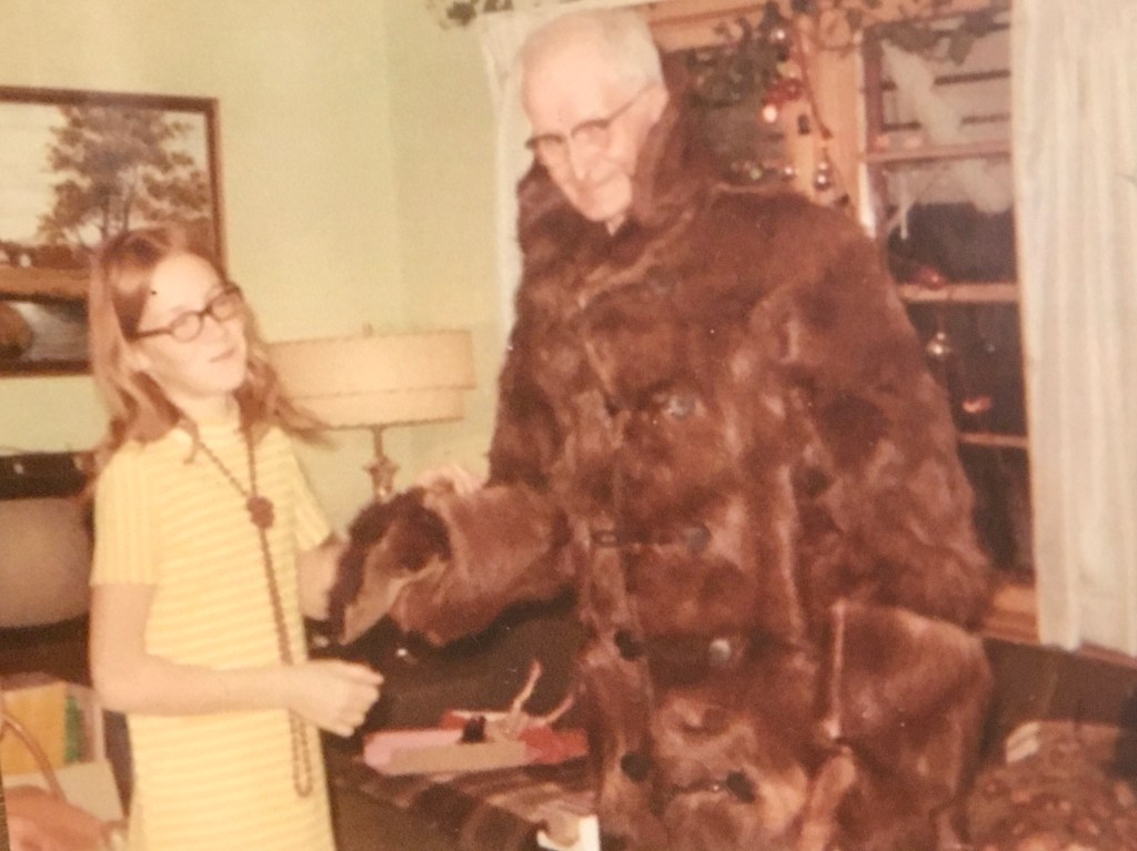 At right, Palmer shows off a horse-hide coat to a grandchild. Notice the original “Summer stream & tree” painting on the wall behind them.