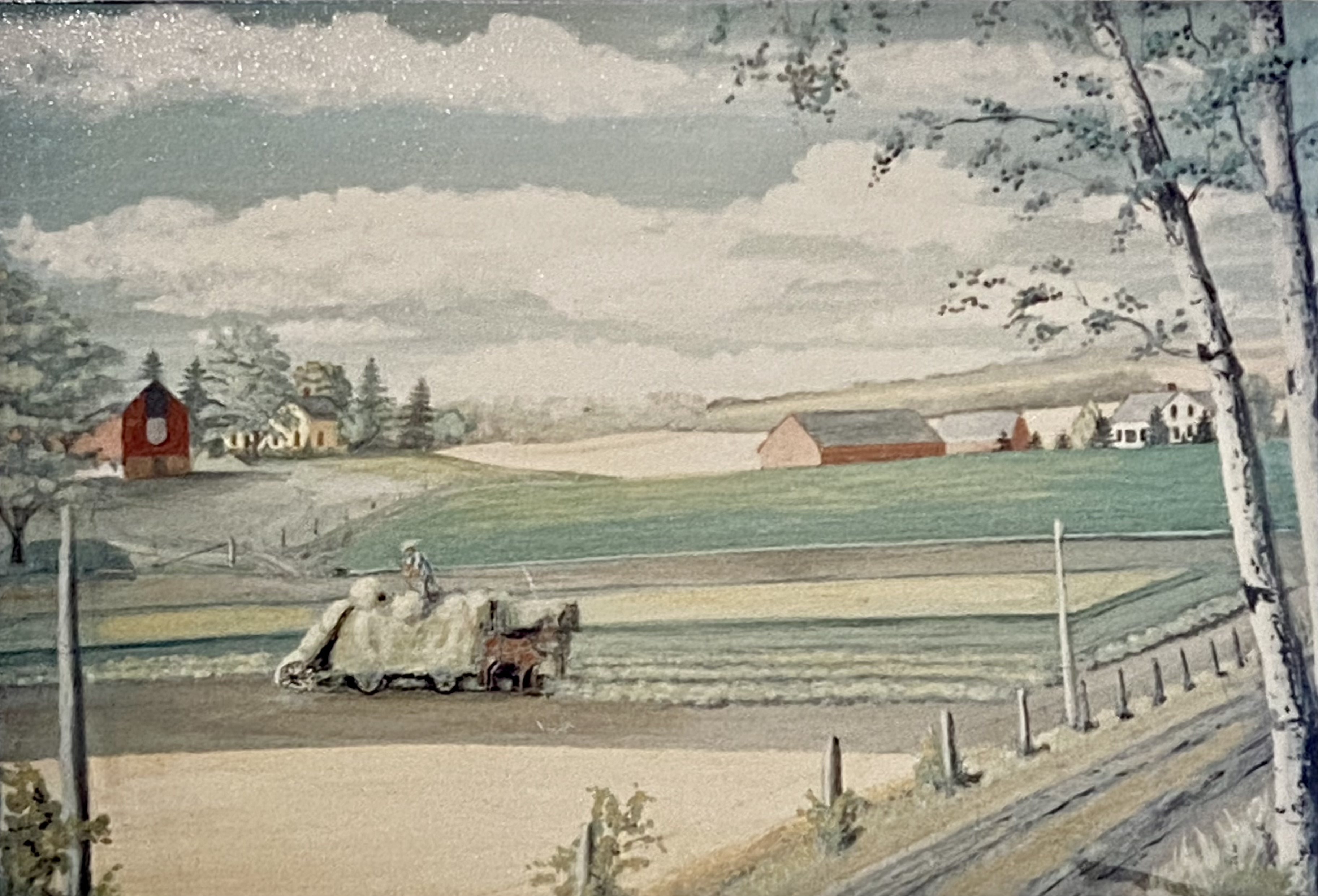 The story goes that Margit painted a farmhand with a pitchfork throwing loads up onto a wagon — and her husband Palmer, who had more experience with hay, laughed at her depiction. She hadn’t realized it wasn’t done that way. Embarrassed, she painted over the guy.