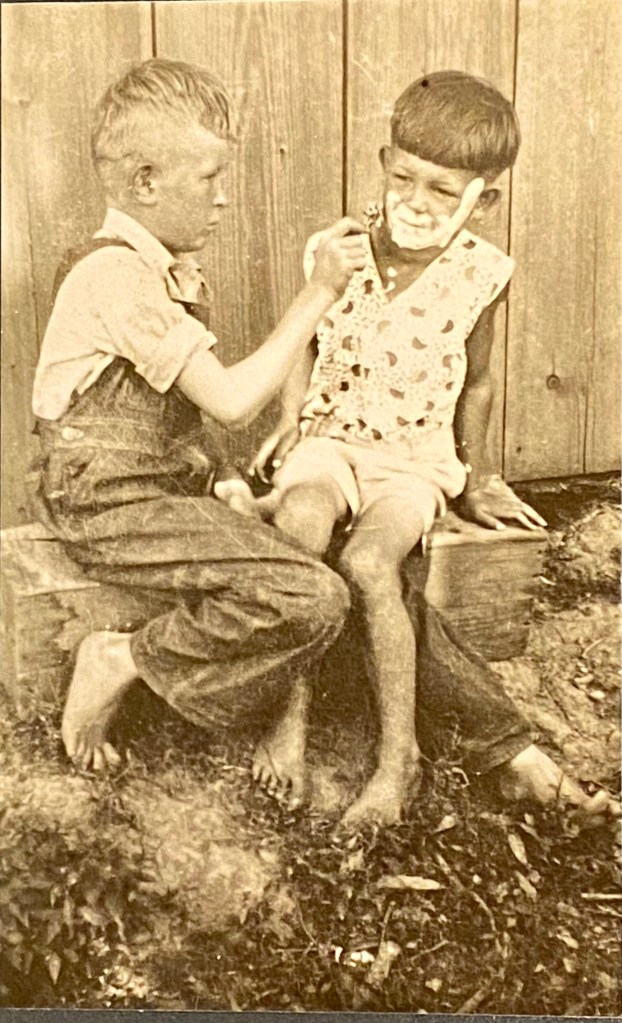 The farm is a good place for children to grow up: fresh air, animals and pets to love, lots of space to run and play. We had milk, butter, potatoes, vegetables, strawberries, and raspberries. We picked black caps and gathered nuts in the woods. I did not list eggs because they were often the only means by which we could trade for sugar, coffee, and kerosine for the lamp and lantern. We ground our own corn meal and wheat for cereal for sorghum syrup.