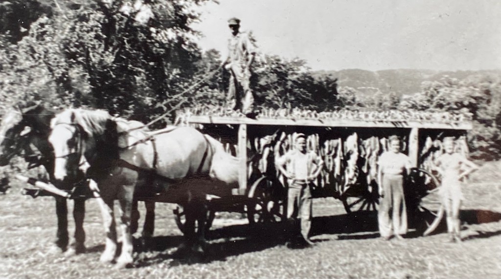 We raised tobacco the three years we were on this farm. In between times Palmer helped neighbors with haying and harvest. We had a good sized garden, strawberry and watermelon patch. The children were in 4-H. Ellert was chosen Houston County 4-H Health champion one year. Ellen was runner-up the next year. We got many compliments on their good posture and healthy looks. Ellen had been homesick the last weeks in Chicago and was glad to be home.