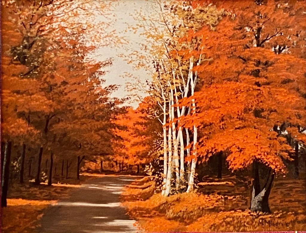 - Comment: The previous paintings are set in the fall, where the shadow of winter is starting to creep into the picture. Here, the time is high summer, though the color violet may not be captured in this photograph, Margit commented once she was surprised to realize how much violet she saw in the countryside. This picture may be as close as Margit gets to impressionism in her brush “strokes”.
