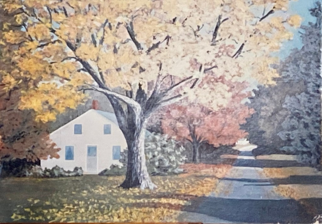 - Comment: An early painting that Margit kept in an upstairs bedroom. A Margit drew a contemporary house that wouldn’t be unusual in the 1950s, a straight road that heads off into a vanishing point in the trees. Margit rarely includes buildings so close to the viewer. And roads are usually curving, not heading straight off into a vanishing point. The balance between domesticity (the home) and going places (the road).