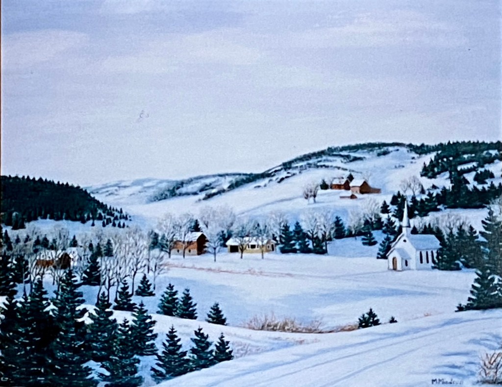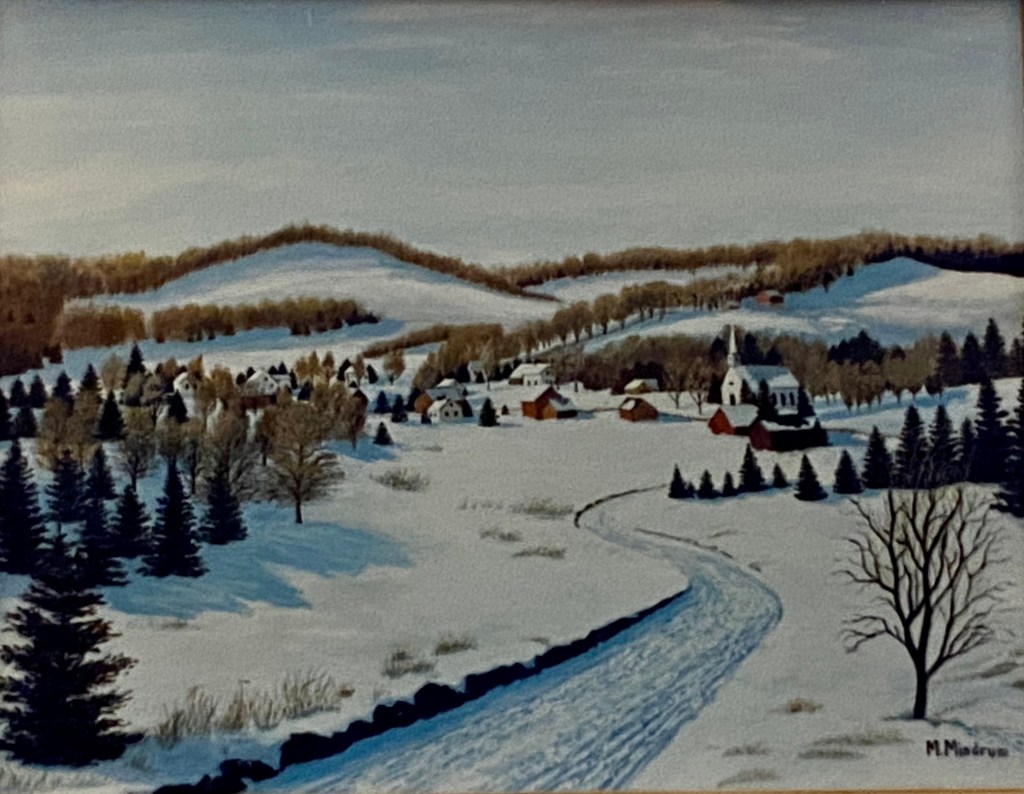 Okay, so “Snowglobe” may be a fanciful title for this line of paintings. (For one, Margit never shows snow actually falling, much less swirling.) But she did create a number of wintery scenes of multiple houses, almost always with a church, in an idealized village setting. “Snowglobe” seems fitting for their quaint quality.