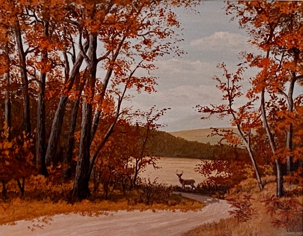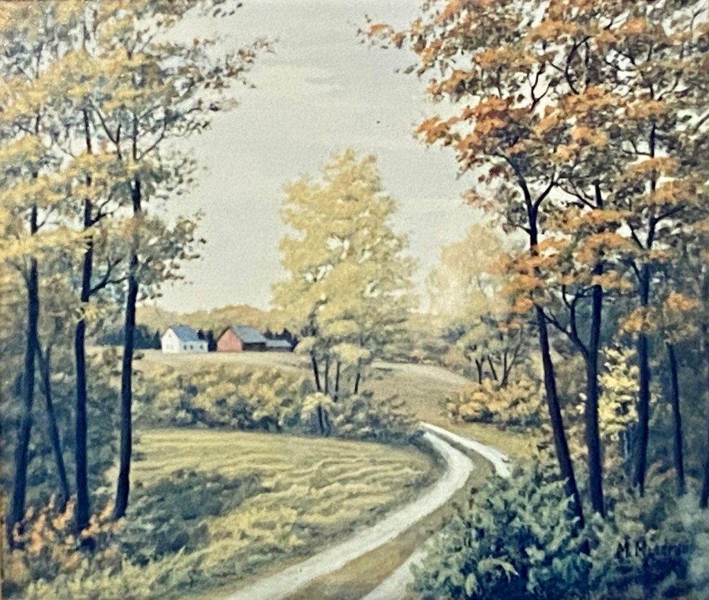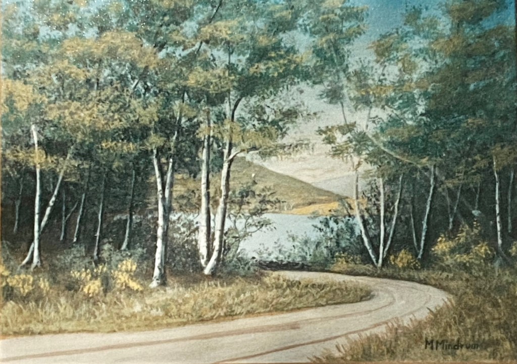 Margit’s daughter Frieda reserved and then bought a painting (ID=74-20) with the intention of giving to some good friends. But Frieda liked the painting so much she kept it for herself. (Sorry, friends!) The scene “Fall colors road” reminded her of walking to school as a child. On the route, she and her siblings passed through trees and came out onto fields. Frieda enjoyed being reminded of that “passing through”. Yes, this journey to somewhere else seems to be another of Margit’s themes. There’s always a road, and something (okay, mostly trees) that you pass though, but the destination glimpsed beyond could be bright fields, a home, or even a lake.