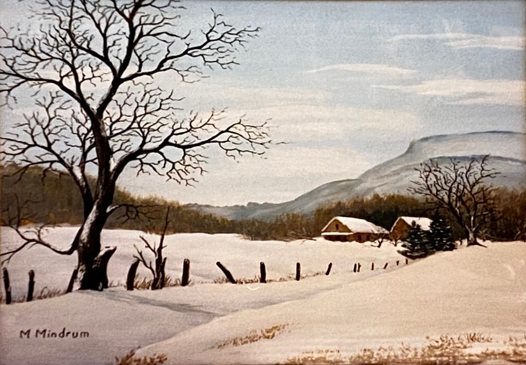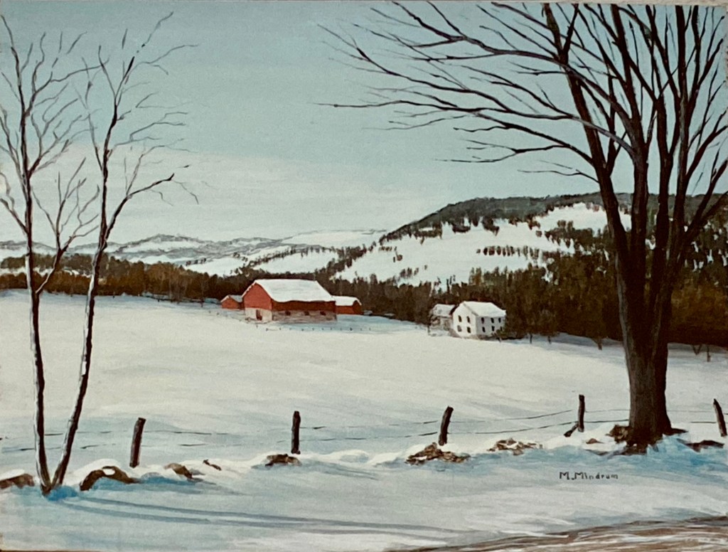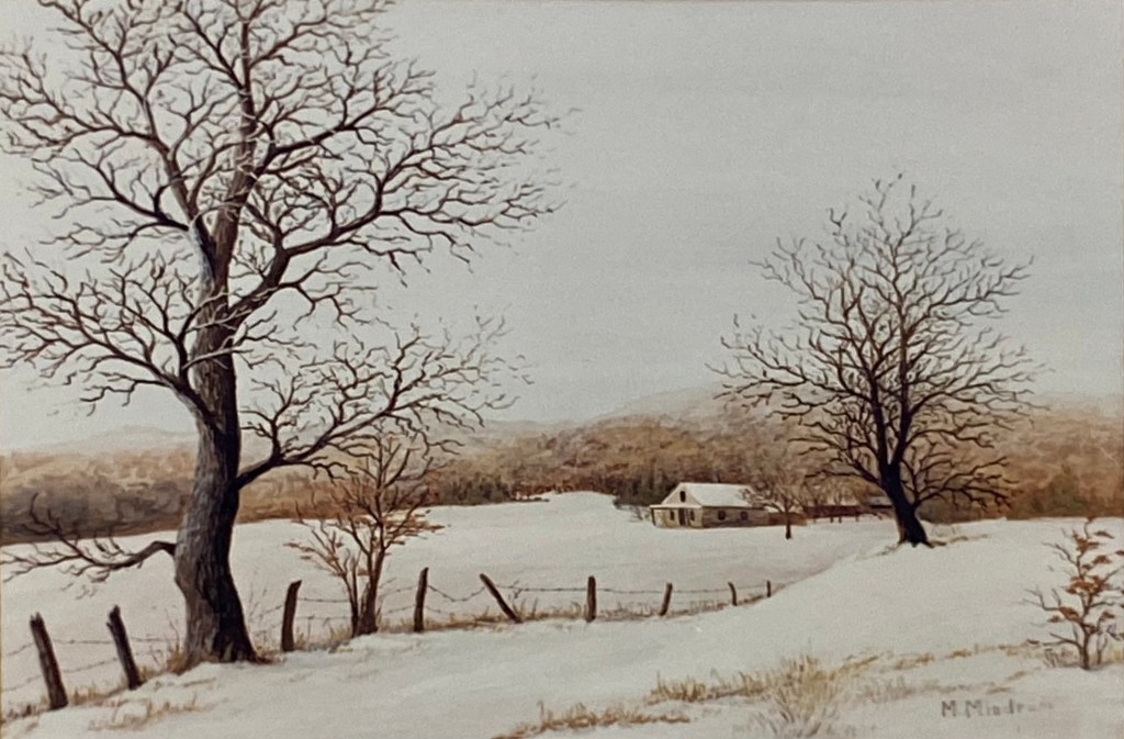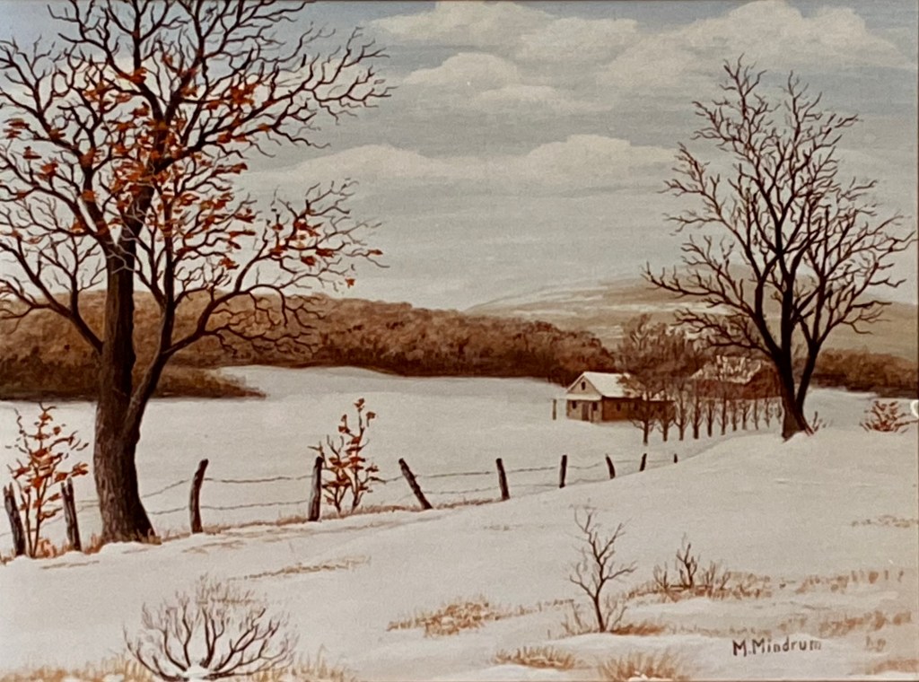 Margit liked to include split-rail or wooden fences in her winter scenes (see Snowy fences). Snow on a wooden fence is undeniably picturesque. But barbed-wire fences are the norm in SE Minnesota. Accordingly, it’s much more common to see barbed-wire fencing stretch across a Margit landscape.