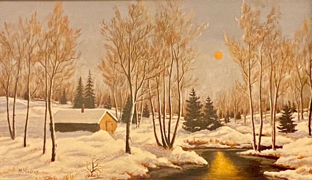 As Margit did most of her painting during the short days of winter, maybe she was still wielding her brush when dusk arrived and her natural sunlight gave way to the glow of moonlight off a countryside of snow. Who knows, but Margit took a break from her typical daylight paintings of “summer stream” and “fall XXX” and experimented with a number of “winter moon” paintings. Though done over a span of years, one consistency in these paintings is the long format of the scene. None are done in Margit’s more usual 16×20 size.